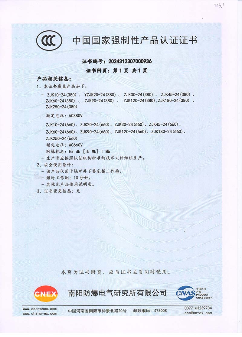 礦用隔爆ZB10-24中國國家強制性產品認證證書110.1